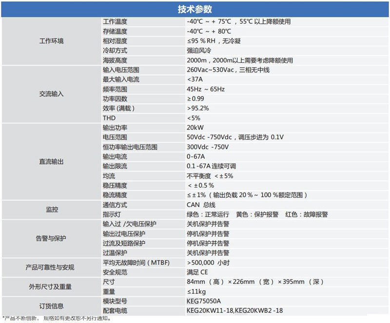 KEG75050A采用的直流充电模块,具有恒功率电压范围宽且不间断、高功率因数、高功率密度、电磁辐射和干扰极小、高可靠性等优点,满足各种电动车的快速充电需求,节能环保效果